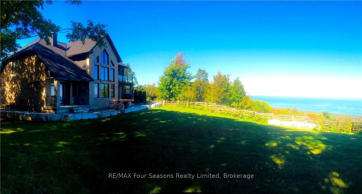 This is a truly unique opportunity to own an exceptional property, boasting breathtaking, close-up views of the seemingly endless Georgian Bay. Spanning 10.66 acres, including 5 acres of manicured grounds & a stream, this estate sits atop Blue Mountain & offers panoramic views over the Town of Collingwood. The custom-built estate home exemplifies the finest quality/craftsmanship, featuring ski hills right at your doorstep. Sitting on solid rock, and a spacious 3,711 sq. ft. of living space, the home is constructed entirely with ICF (Insulated Concrete Form) 8" concrete forms with steel, for superior insulation + durability. Inside, you'll find 4 bedrooms, including 2 primary suites-one on the main floor with patio access and one on the upper floor with a balcony. The home includes 3.5 bathrooms and abundant natural light through large windows, all of which showcase views of Georgian Bay. There is also the potential to add two more bedrooms with a minor renovation. Key interior features include a striking two-storey tile fireplace with chrome detailing, a Caesarstone waterfall island in the kitchen & a climate-controlled wine cellar adjacent to the kitchen. The dining room opens to a covered flagstone patio, perfect for entertaining. The homes exterior is clad in hand-honed local limestone with an Enviroshake roof. Beyond the main residence, the property features a custom-built saltwater pool, a pool house, and a massive 3-car garage with an attached heated studio-ideal for a gym, with natural light and more views from a large window. Additional features include a propane back-up generator, buried Hydro cables + a 165' deep well for emergencies. The gated stone entry leads to a long driveway, surrounded by mature maple & pine trees, enhancing privacy and natural beauty. At the far end of the property, youll find access to the renowned Bruce Trail, ideal for outdoor enthusiasts, + skiing, hiking, biking and multiple additional activities in the immediate vicinity.
